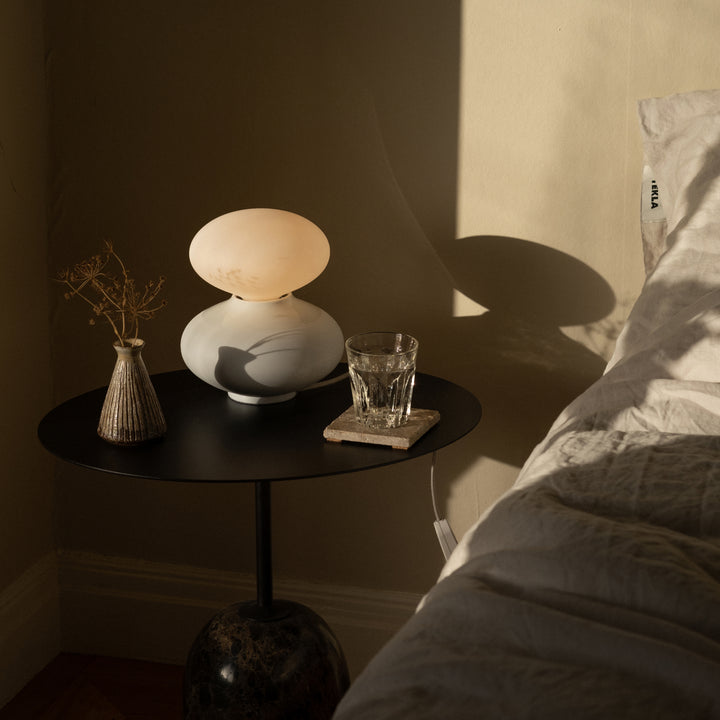 A Knuckle Table Lamp + Sphere IV facing the sea, showing Tala's commitment to people, planet, and purpose as a Certified B Corporation.