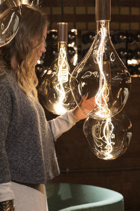 Once the bulb is on, the light is uniquely reflected and refracted within each bulb to create the unique sinuous, golden glow.