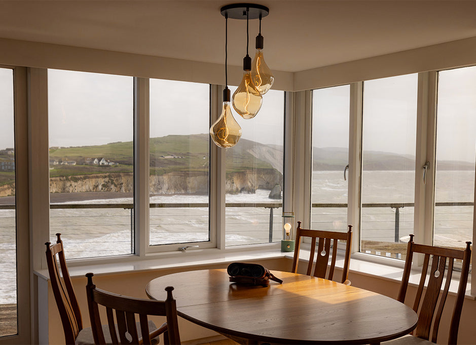 In the kitchen, the Triple Pendant + Voronoi II enhances the panoramic scenery, with the soft curves of the bulbs mirroring the waves of the sea. The Muse Portable Lamp in Pleasure Garden Green is enjoying the view from the corner of the room.