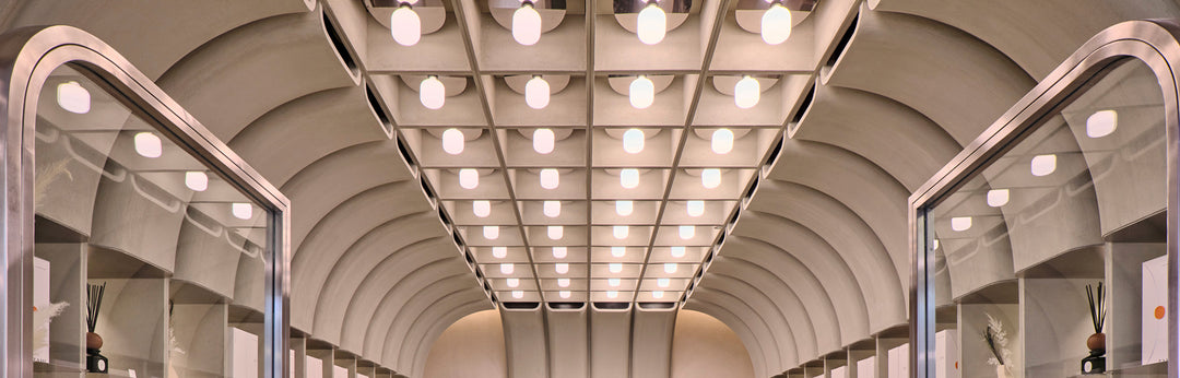 Utilising dozens of Oblo bulbs in the recessed ceiling, the lighting complements the soft, delicate palette of the sales counter and display shelves, while staying true to the client’s design ethos.