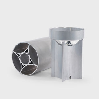 Foregoing an applied finish, the aluminium is anodised from its raw state (pictured) to create the distinct tones and showcase the material’s natural lustre.