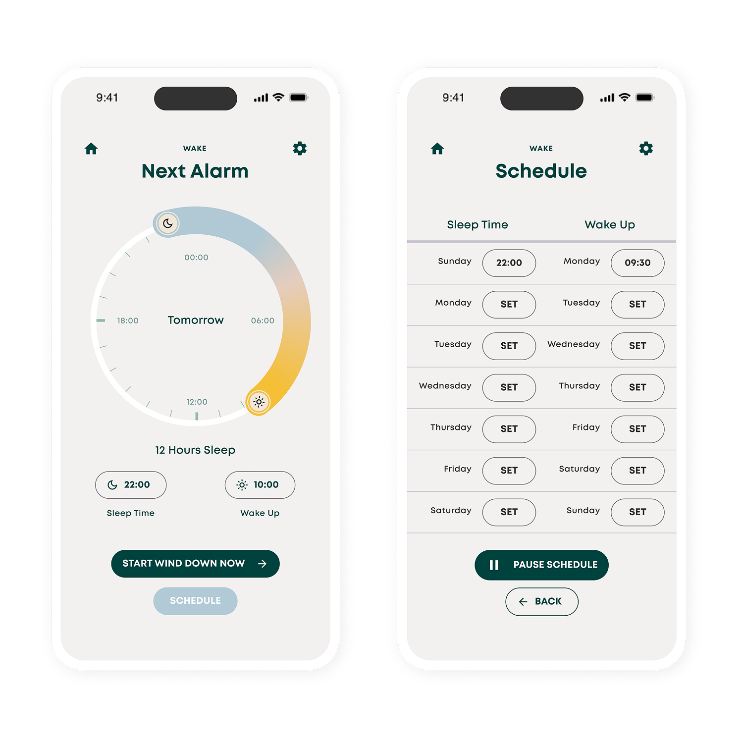 Schedule daily wake up and wind down times to promote regulated sleep patterns. Configure settings on the lamp body or in the Tala App.