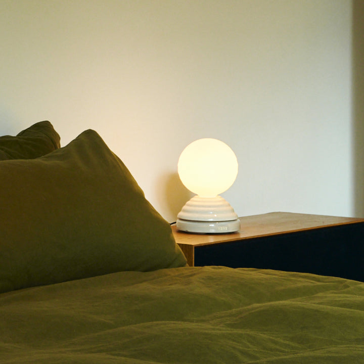 The ripples of the bulb and base represent the reflections of a sunset across a body of water, creating a soft silhouette that embodies a peaceful environment. The smooth ceramic body encourages tactile interaction, allowing you to adjust the light’s brightness by turning the ergonomic body.