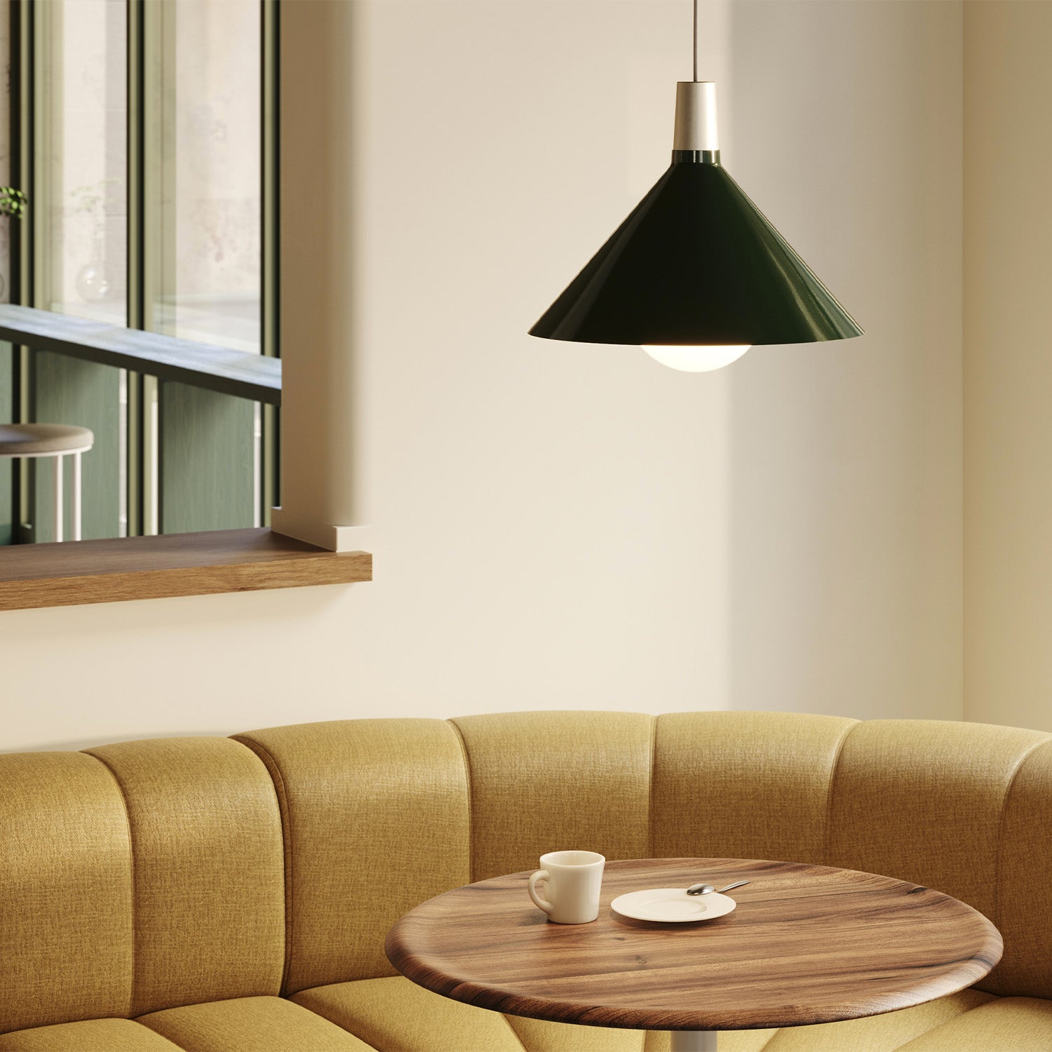 Debut shaded pendant system from Tala. A contemporary take on an industrial classic. Available in Small, Medium and Large in White, Dark Green, and Yellow. Pre-paired with an Oval II Light Bulb.