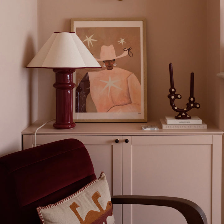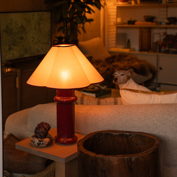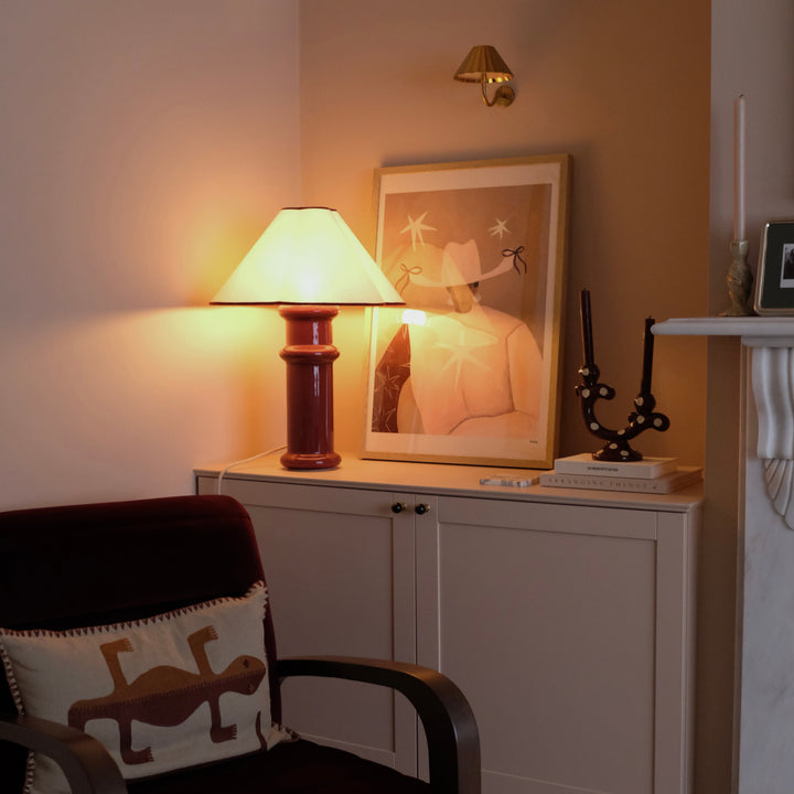 “Heath takes its form from the surrounding architecture of our London studio. Inspired by tall Victorian chimney pots, the lamp celebrates a sense of grounding and quiet familiarity. Crafted in collaboration with skilled ceramists in Portugal, its exaggerated curves and high-gloss glaze gently reflect the light, balancing architectural structure with a relaxed presence. The shade diffuses the glow while introducing a delicate, organic contrast to the ceramic base, referencing wildflowers and clovers found within the built environment.”