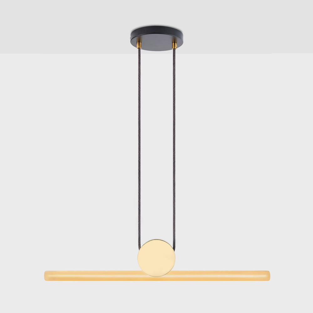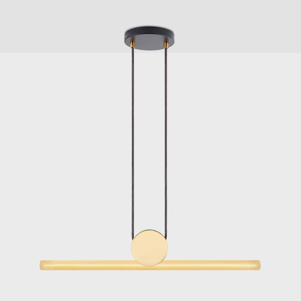 Kilter means balance. Named in reference to the delicate confluence of the linear light source and central fixture, the light frosted finish subtly exposes and celebrates the internal filament when illuminated. The Kilter Pendant is inspired by the form of a traditional clock pendulum.