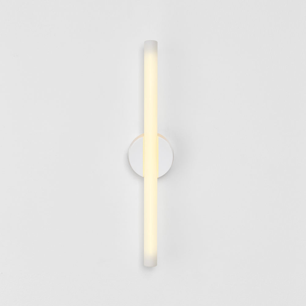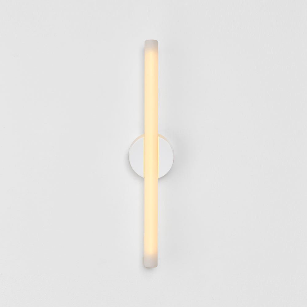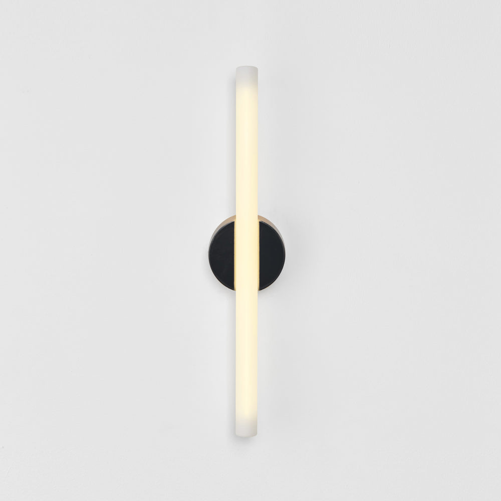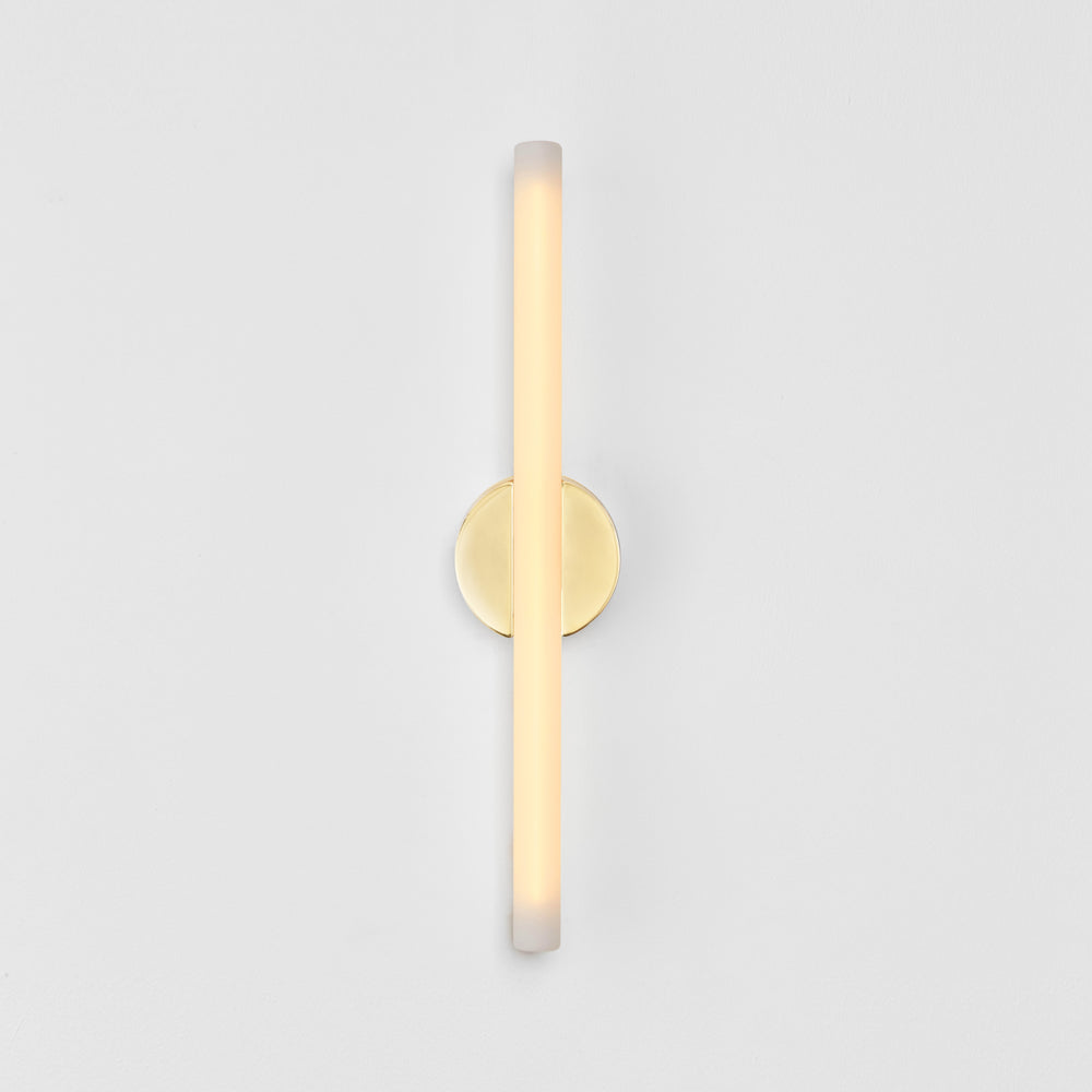Named in reference to the delicate confluence of the linear light source and central pivoting fixture, the light frosted finish subtly exposes and celebrates the internal filament when illuminated while maintaining the form of a typical S14d light source.