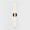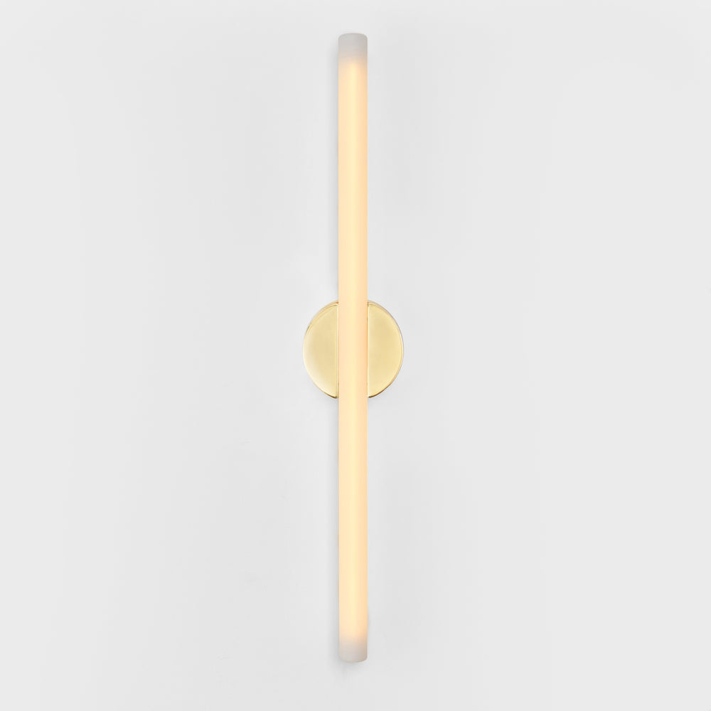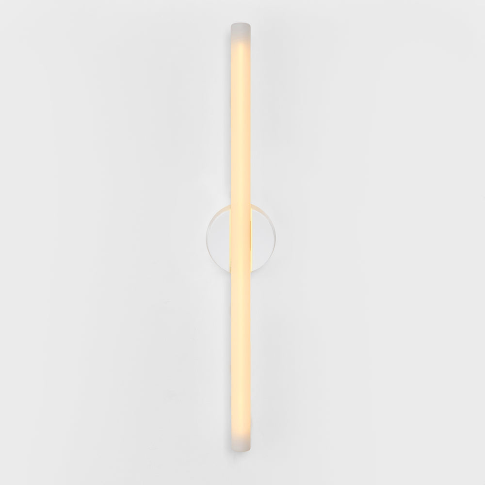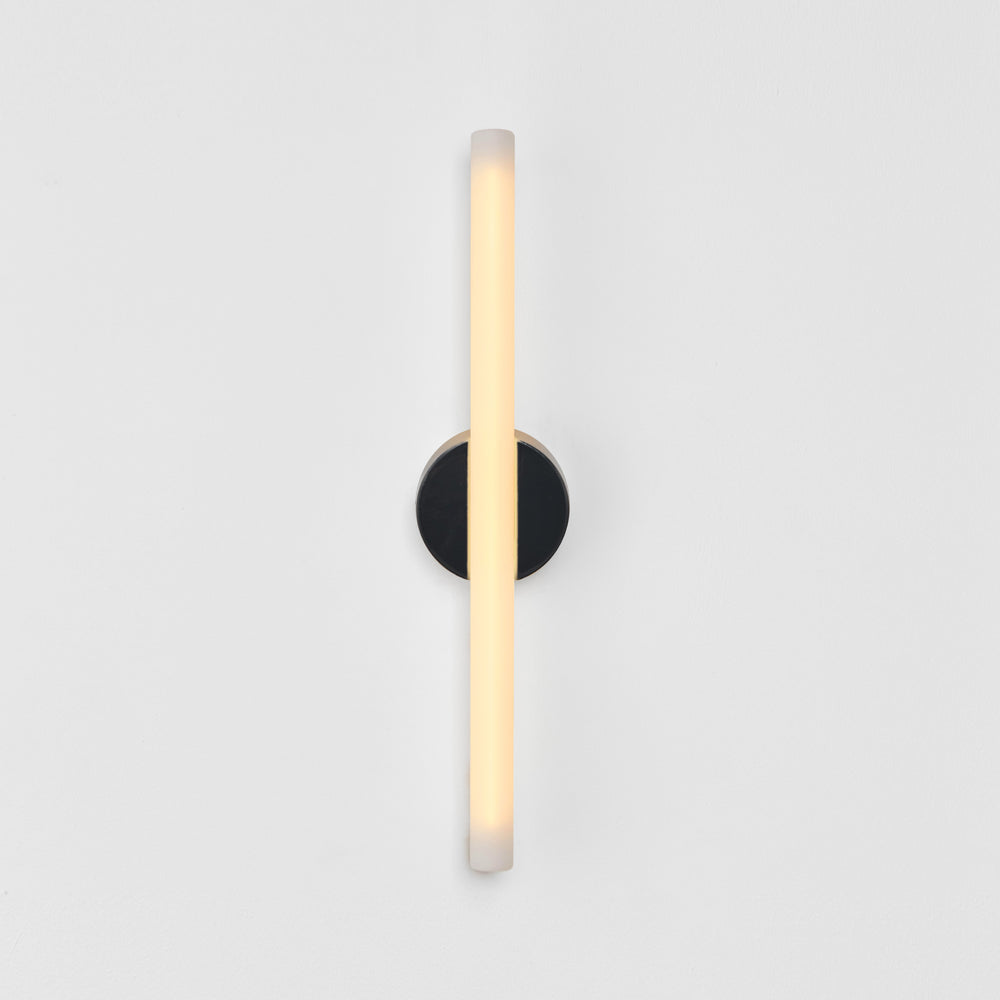 Named in reference to the delicate confluence of the linear light source and central pivoting fixture, the light frosted finish subtly exposes and celebrates the internal filament when illuminated while maintaining the form of a typical S14d light source.