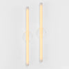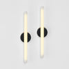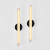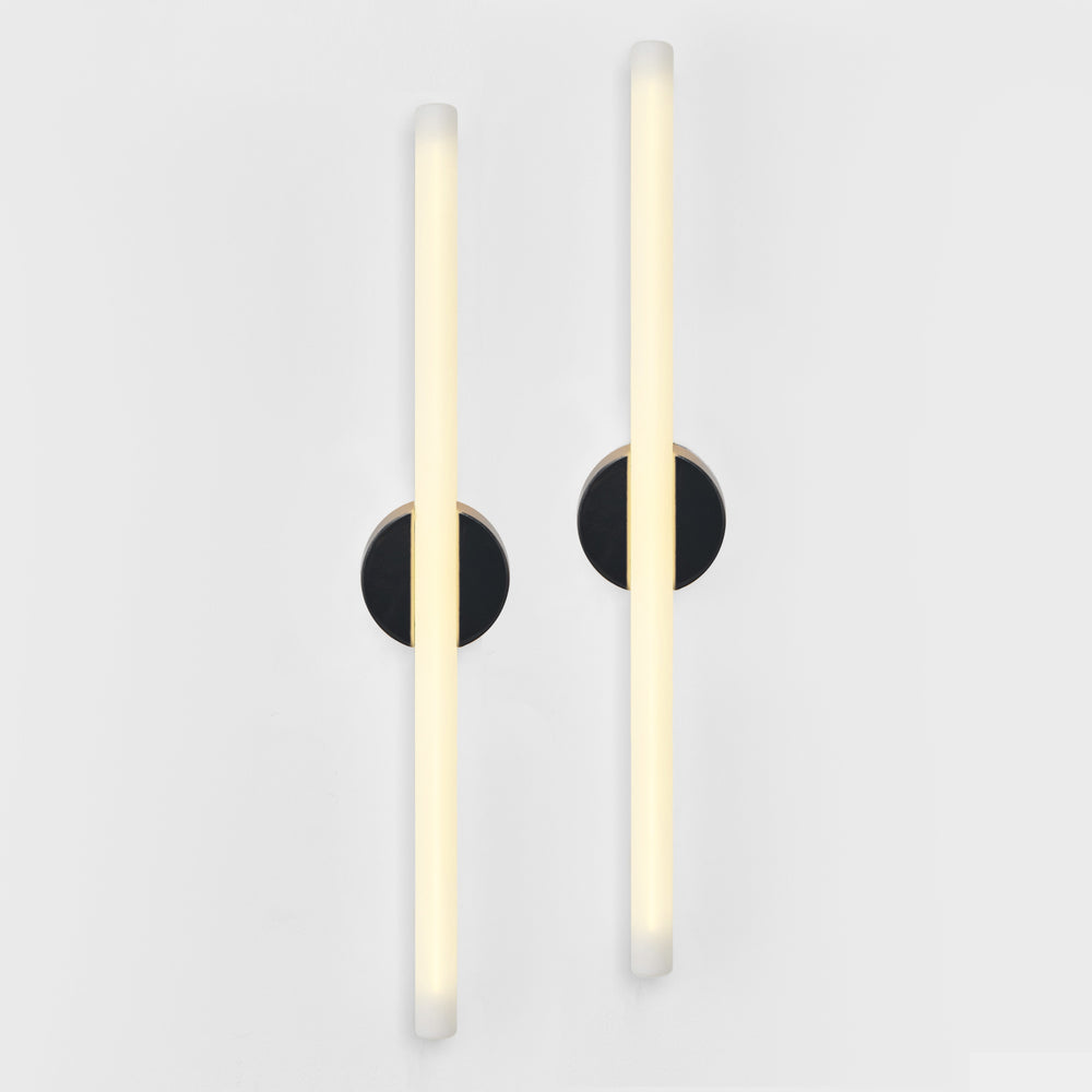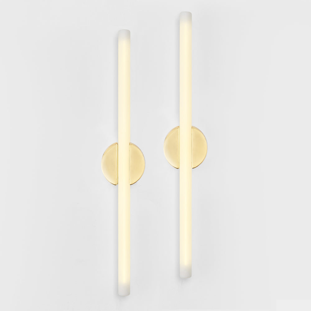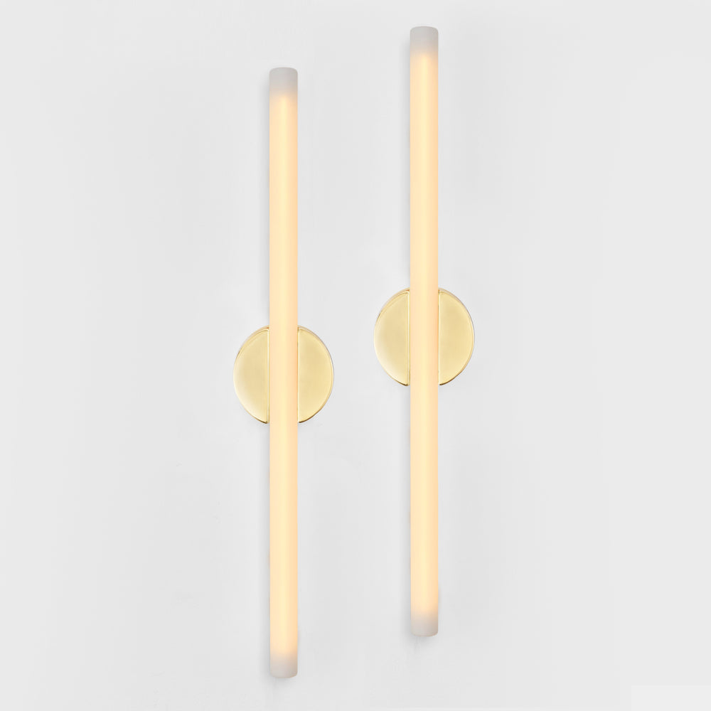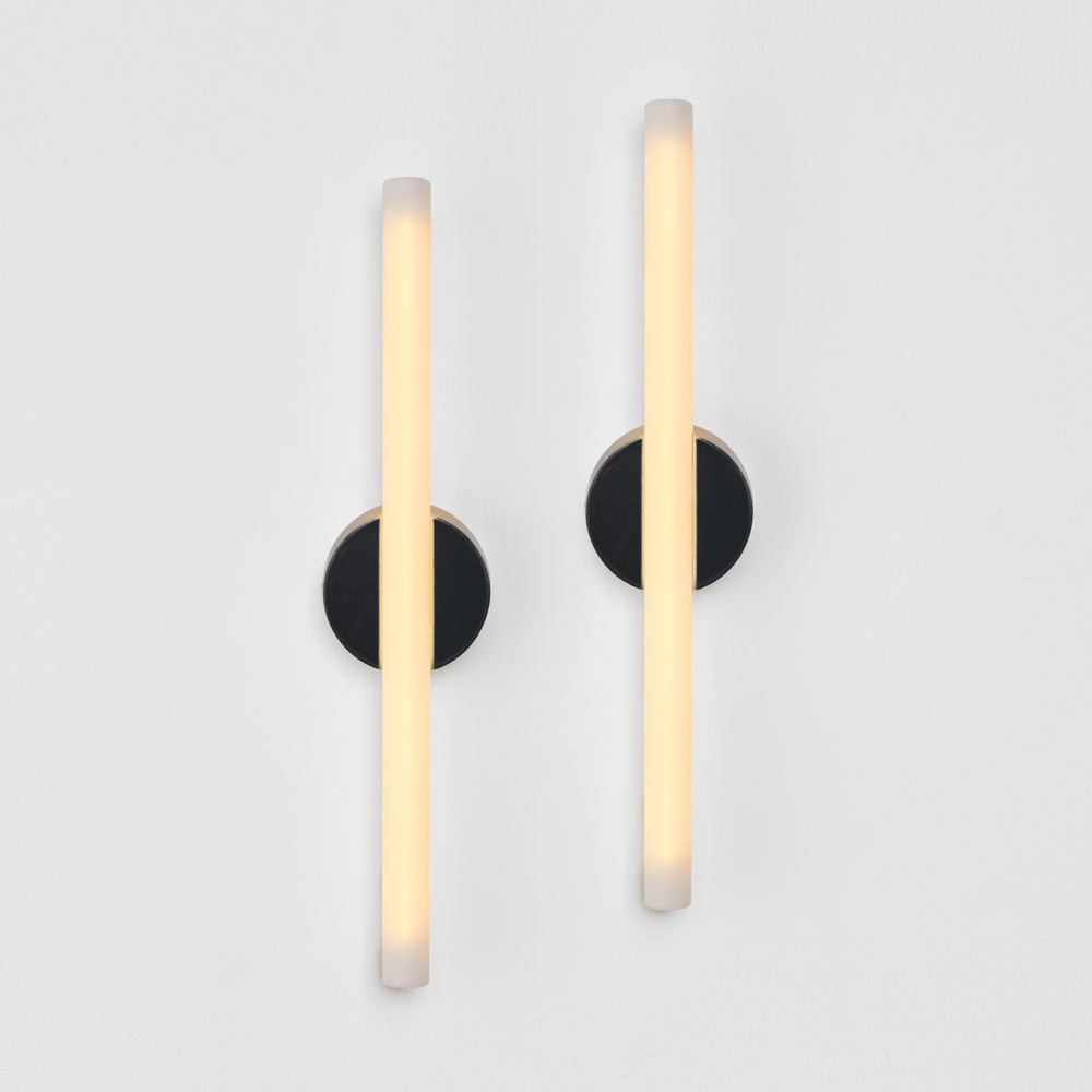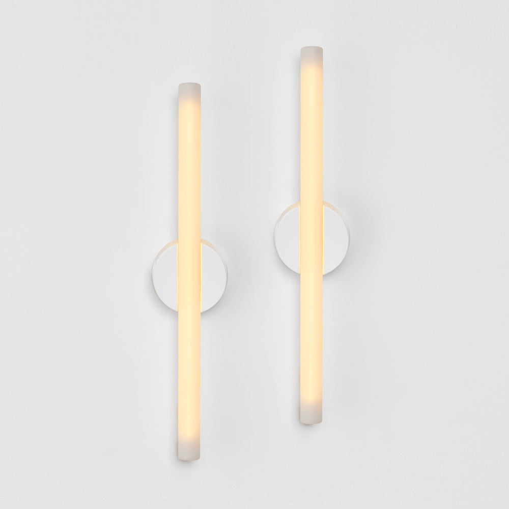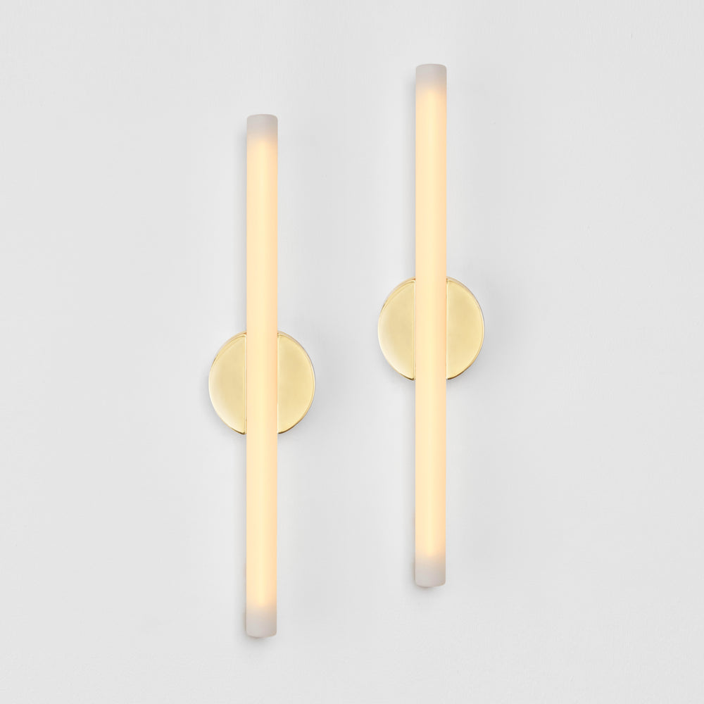 Named in reference to the delicate confluence of the linear light source and central pivoting fixture, the light frosted finish subtly exposes and celebrates the internal filament when illuminated while maintaining the form of a typical S14d light source.
