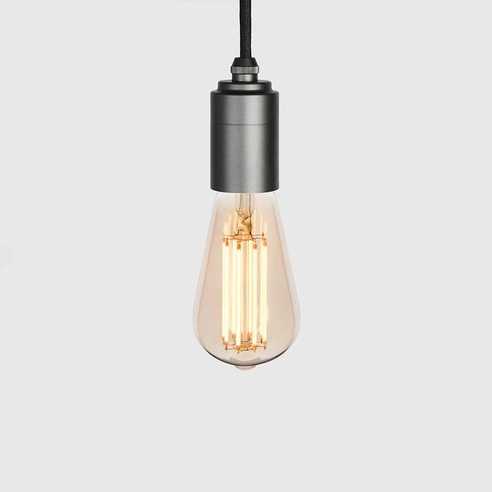 The industrial-style Squirrel Cage bulb, with its iron-tint glass finish and exposed filament design, emits a warm, amber hue. Paired with the Brass, Graphite, Oak or Walnut pendant, this is a ready-made lighting fixture all in one.