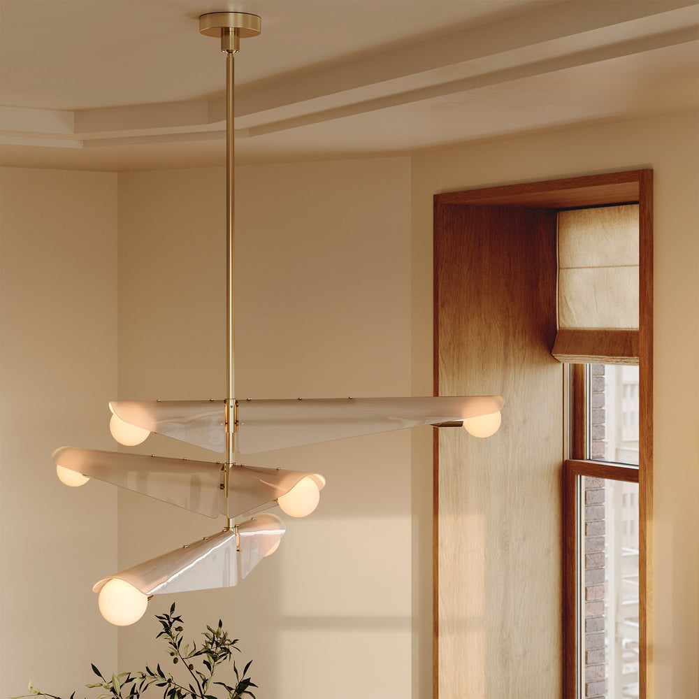 "Our Sycamore Chandelier was inspired by the elegant fall of helicopter seeds, it features glass wings that gently curve over a brass frame, capturing the seed's translucent quality.