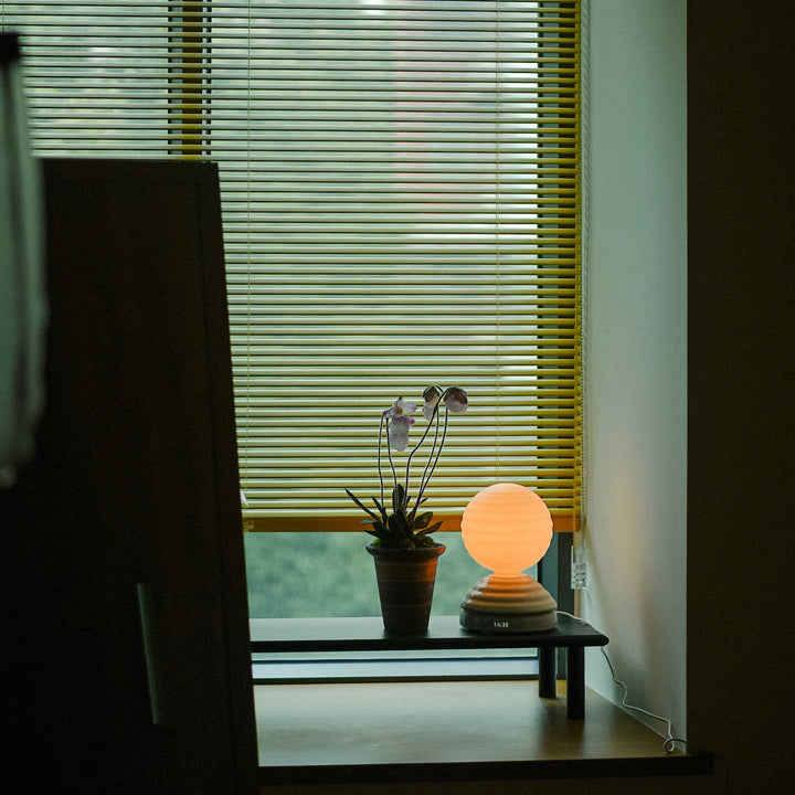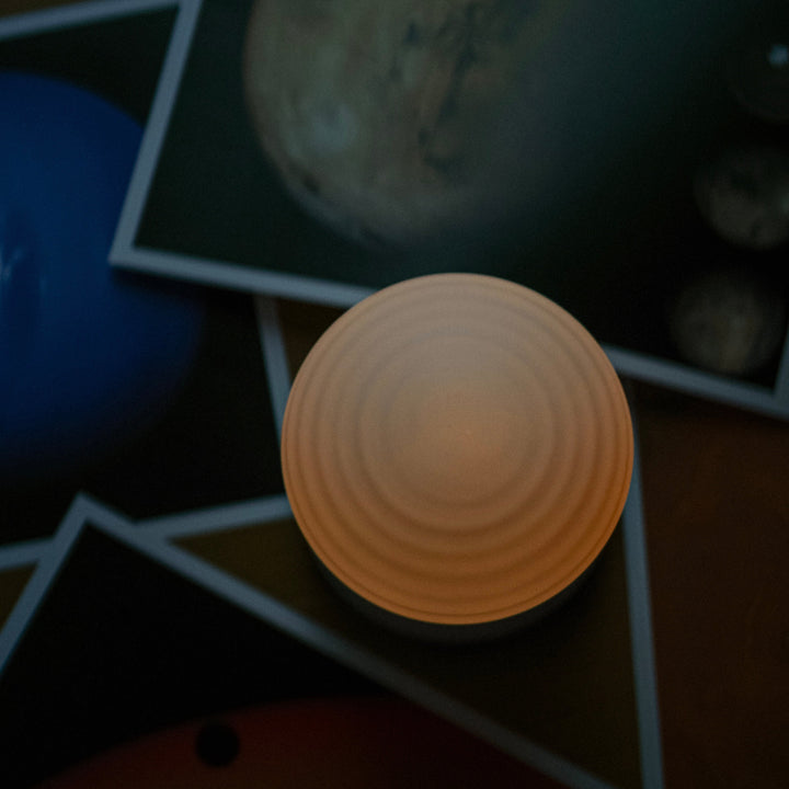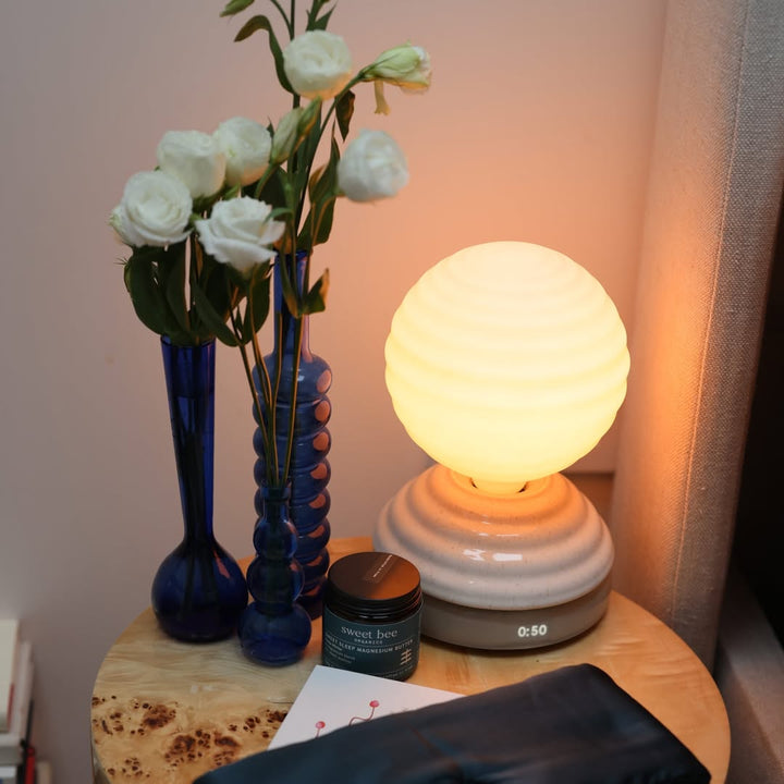 We deliberately wanted to avoid visible plastic, shiny metal, and so the palette of glass for the bulb and undulating ceramic for the base felt to us much more in tune with the topic of natural sleep."